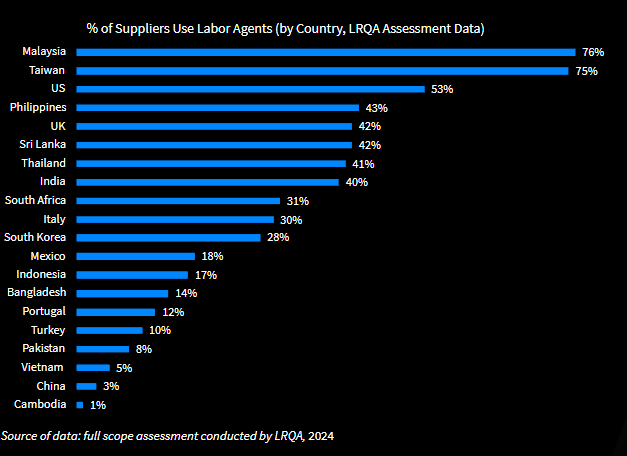 Compounding forced labour risks could be the rise of labour recruitment agencies operating across global supply chains, often in opaque conditions that increase worker vulnerability and obscure accountability. As migrant workers are often the most susceptible to exploitation, use of labour agencies can exacerbate risk for violations such as unlawful recruitment fees, document withholding and poor conditions for workers.